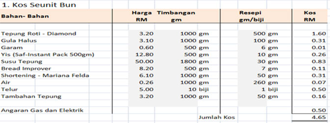 Langkah Ketiga ialah mengira berapa kos sebiji bun. Seperti pengiraan langkah kedua, resepi di atas boleh menghasilkan 26 biji bun. Manakala jumlah kos seperti di dalam table sebelum ini ialah RM4.65. Jadi pengiraan kos untuk sebiji bun ialah jumlah kos RM 4.65 / 26 biji = RM0.18. Maka kos sebiji bun ialah Rm0.18