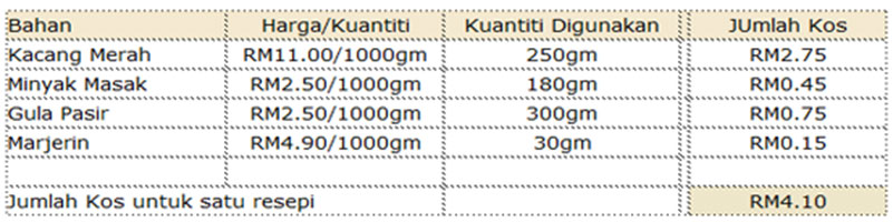 Seterusnya kita buat pengiraan kos inti kacang merah. Caranya sama sahaja seperti pengiraan kos seunit bun sebelum ini. Dibawah ini pengiraan kos bahannya.